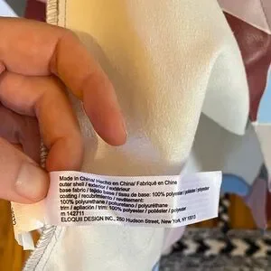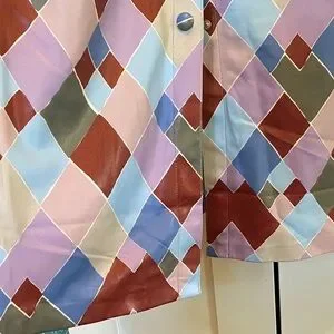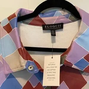 Chic Eloquii faux leather dress with diamond pattern. Features a belted waist and button-up front. Includes shades of blue, red, and purple.