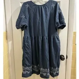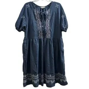 Short-Sleeve Embroidered Dress from Knox Rose. Made of a soft & flowy breathable fabric blend of cotton & rayon. Decorated w contrasting-color bordered-pattern polyester embroidery on the front & hemline, along with matching motifs on the raglan short sleeves. Comfortable material & cut. Fabric-covered buttons down the front bodice along w tassel string ties on the V-neckline. Cinched-cuff/ elastic gathered sleeves & soft-pleated skirt. Decent pockets. Wear with flats or ankle boots. Maybe even layer w leggings. Boho look. Size XL. good use condition with a couple of imperfections on embroidery as shown in picture. Make a reasonable offer. Or browse & message 4 great bundle deal!