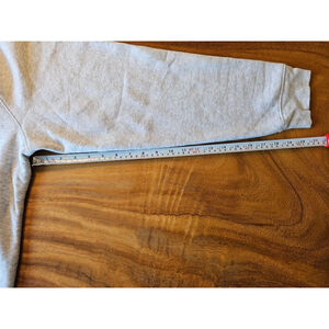 This is a Brunette The Label women's oversized sweatshirt in a medium/large gray color with burgundy velvet lettering. The front features "THE BABES CLUB". It has a crew neck and raglan sleeves. The fabric content is 55% polyester and 45% cotton. Measurements in photos.