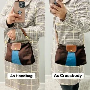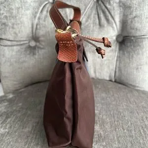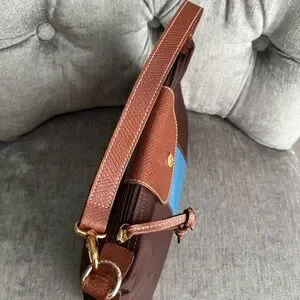 Stylish Longchamp mini bag. Features brown body with blue accent. Perfect for any occasion.