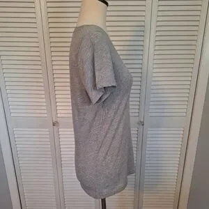 Stay comfortable and stylish with this Nike women's gray V-neck dri fit T-shirt. Perfect for casual outings or workouts. cap sleeves. size small. armpit to Armpit is 17", shoulder to hem is 25". lots of wear left but it does have a missing dye spot. see pic.