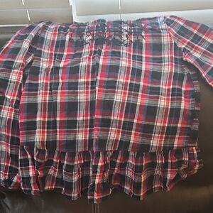Stylish shirt set featuring a blue and white striped shirt and a red, navy, and white plaid shirt w detail & pleated edge. Perfect for versatile styling. Sz S. Great condition.