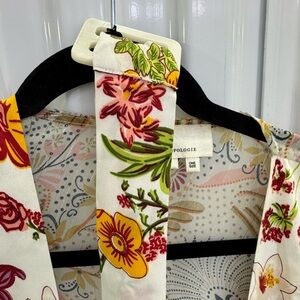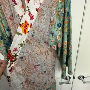 Elegant floral kimono duster with a mix of vibrant colors. Perfect for a stylish and comfortable look. Includes a belt.