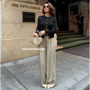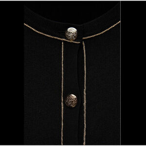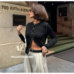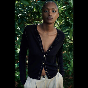 Black/white round neck long sleeve cardigan. Contrasting piping detail. Front closure with embossed gold buttons. From ZARA, in size M and L. New with tags. Sold out in stores.