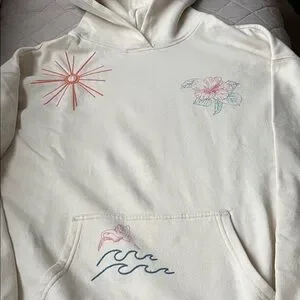 Cozy cream hoodie. Features pink floral and sun designs. Blue wave detail on pocket. Perfect for casual wear.