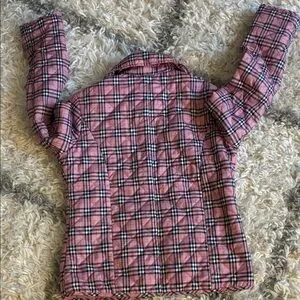 Stylish pink plaid jacket. Button-up front. Perfect for cool weather.