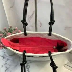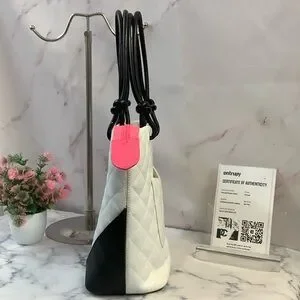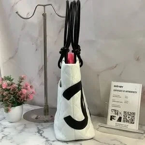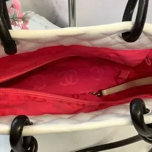 H7- Stylish CHANEL tote with iconic quilted pattern. Features bold black accents on white. Ideal for a chic look. Drop handles measures 7 and 1/2". Interior: pink lining, 2 -pen pockets, two zipper pockets, lanyard with clasp, zipper closure. Includes Certificate of Authenticity.