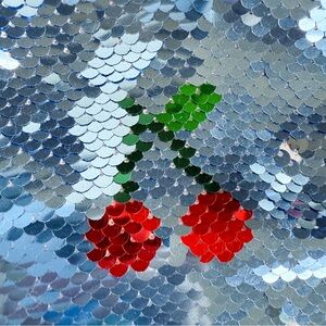 Relevant tags: retro, dopamine dressing, maximalist, princess, sparkly, glitter, sequined, fun, bold, colorful, statement, trendy, girly, Y2K, retro, whimsical, playful, partywear, holiday, cherry print, sporty, varsity, lightweight jacket, fall fashion, avant garde, layering, fruit, whimsical