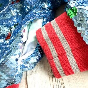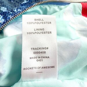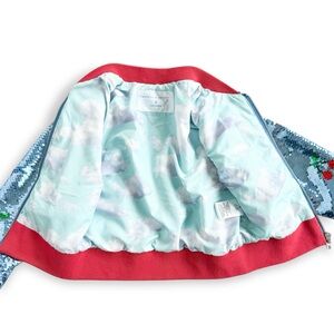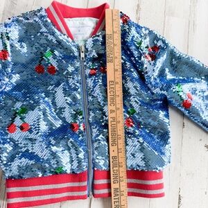 Rockets of Awesome girls’ bomber jacket, size 5. Covered in shimmering light blue sequins with red cherry print all over, vibrant red trim with metallic stripes, and a cute sky-print lining. Zip-front closure. So much fun!!