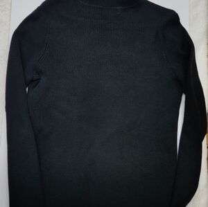 Elegant black turtleneck sweater. Features gold trim on collar and cuffs. Perfect for a sophisticated look.