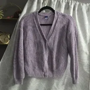 Chic lavender cardigan. Soft knit fabric. Ideal for layering.