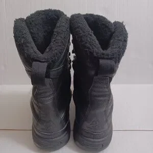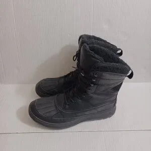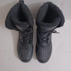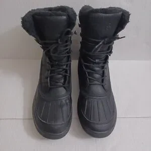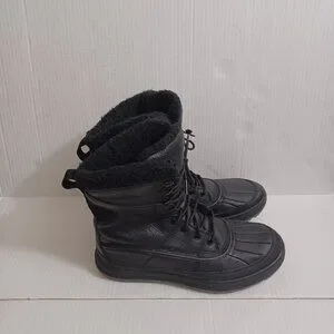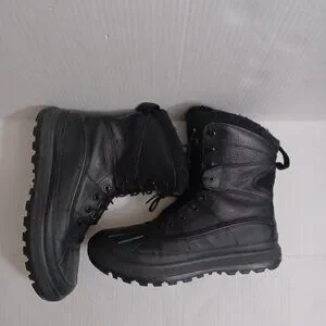 Size 10 Men's Nike ACG Woodside ll Boots has lace up closure, front duck boot style feature, and sherpa like lining on the inner and outer top area of boots in the color black. Note the shoelace on the right boot has wear as seen in photos otherwise in good preowned condition. Style# 535601-010