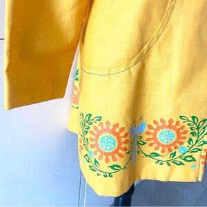 Bright yellow jacket with floral stamping that mimics embroidery. Features a front zipper and long sleeves. Unique and stylish design. Iconic dagger collar. Green top stitching. Colour is a warm yellow. Floral detail is green, orange and light blue.