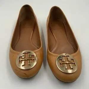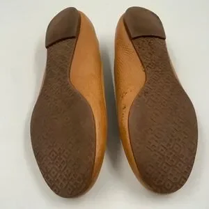 Elegant simplicity embodies these classic ballet flats. Supple tan leather forms a timeless silhouette, embracing your foot in understated luxury. A gleaming gold Tory Burch logo medallion adds a touch of signature polish, elevating the design with a subtle yet unmistakable statement. These flats are a versatile choice, perfect for adding sophistication to a casual brunch, complementing a polished work ensemble, or offering comfortable chicness on a weekend getaway. Some scuffing.