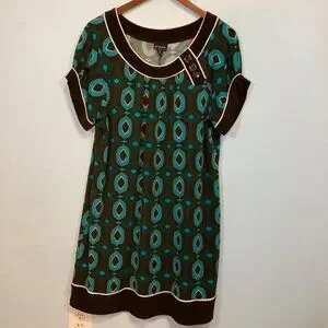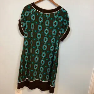 70s-inspired En Focus Studio women’s dress in size 16 featuring a bold mod geometric print. This retro-chic dress combines vintage flair with a flattering silhouette, perfect for both casual and dressy occasions. Soft, stretchy fabric ensures comfort and easy movement.