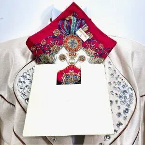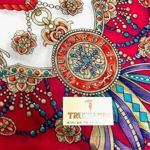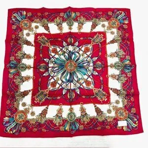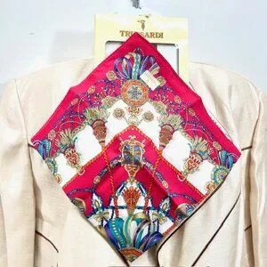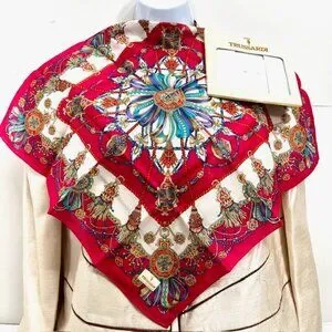 #39. New in Box Trussadi handkerchief/ mini scarf made in Japan of cotton 20"x20" with designed ottoman character tassel bow ribbin beads , floral pattern in red pink, white purple , and green colors unique design for chacint piece.
