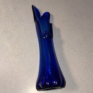 Beautifully crafted blue glass vase with a unique wavy design. Perfect for adding a touch of elegance to any room. Two small chips as shown in last pic.