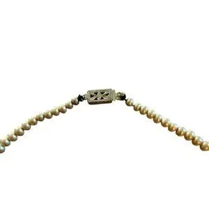 This 1920s bib choker features graduated faux pearls and an ornate clasp, offering a timeless and elegant style for formal or professional occasions.