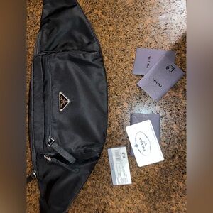 Chic black nylon beltbag with signature Prada emblem. Ideal for carrying essentials. Perfect for everyday and vacations. Worn a handful of times. Would technically classify as unisex just because it’s a universal style. Comes with authenticity cards, dust bag and box. Full length of strap unclipped (buckle to buckle) is 52”. Smallest pocket dimensions are 4.5”x8”. Middle pocket dimensions are 6”x8.5”. Largest pocket is 18”x8”. Expansion amount not accounted for in pockets’ sizes. Let me know if you have any other questions! ☺️