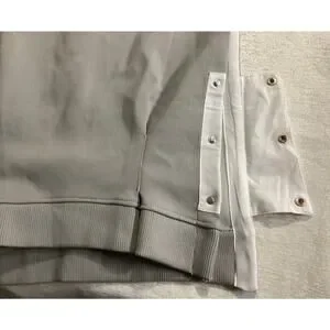 Boxy style rib knit pleated front.The sides have a side snap on closure contrasting fabric detail with tie belt. There is a ribbed hemline at the bottom. The top is made of a textured fabric.