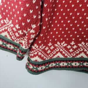 Classic vintage L.L.Bean Nordic sweater, women’s size Large. Made in Australia, crafted in 100% cotton with a traditional red, white, and green Fair Isle pattern. Features metal clasp buttons at neckline.