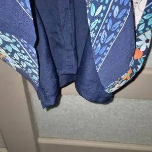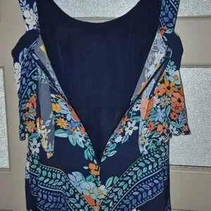 Navy mini dress with vibrant floral design. Features orange, white, and light blue flowers. Perfect for casual wear.