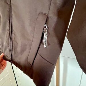 Stylish espresso women’s soft shell jacket. Features zip closure and pockets. Perfect for outdoor adventures or running errands on a chilly day.