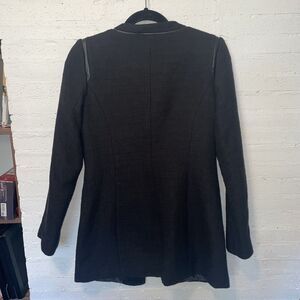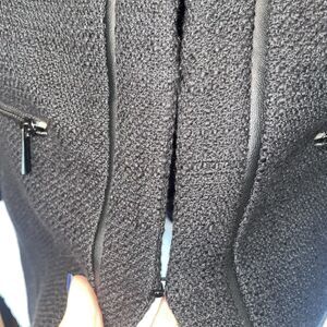 This Karl Lagerfeld Tweed Black Blazer/Jacket in size 2 is a stylish and versatile option for women. The jacket features 4 zipper pockets on the front, vegan leather accents, a tweed outer shell material with long sleeves and a hook & eye closure. It is suitable for casual, workwear, and business occasions.The black color and leather accents add a touch of luxury to the jacket, making it a chic and fashionable choice for any wardrobe.