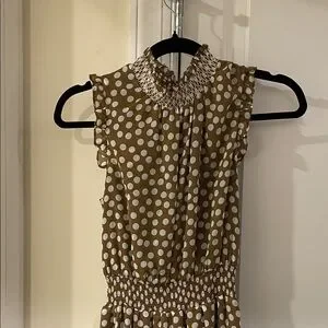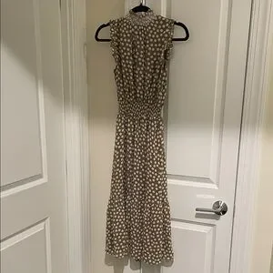 Chic and stylish sleeveless dress featuring a playful polka dot pattern. Perfect for any occasion, this brown and white dress offers a flattering fit and timeless appeal. Cinched waist, midi length. Size 00, excellent condition
