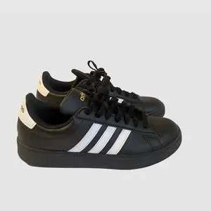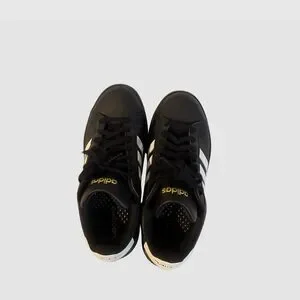 Sleek black Adidas sneakers featuring iconic white stripes. Ideal for everyday style.
