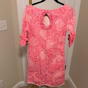 Classic Lilly Pulitzer shift dress in a bright pink-and-white floral pattern with feminine details throughout. Features 3/4 sleeves with ruffled cuffs, a keyhole back with gathered trim, and a flattering tailored fit. Perfect for brunches, spring events, or coastal getaways.