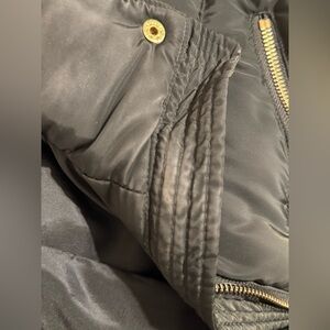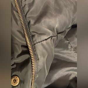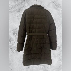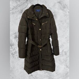 Chic and cozy puffer coat. Features a belted waist and gold accents.