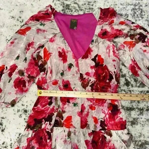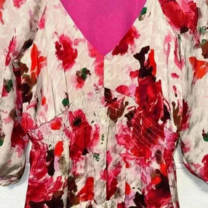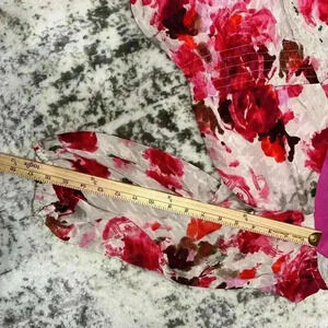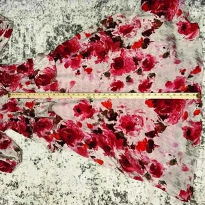 This is a pre-owned women's dress by the brand "Taylor", featuring a floral print in shades of pink, red, and white on a beige background. The dress has a V-neckline, 3/4 sleeves, and a fitted bodice with a gathered skirt. The fabric is a lightweight, silky material. The dress measures approximately 35 inches in length, 14 inches across the shoulders, and 16 inches across the bust. The dress is in good condition with no visible signs of wear or damage. The dress is unknown just see photos for measurements.
