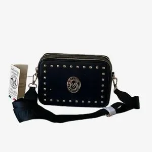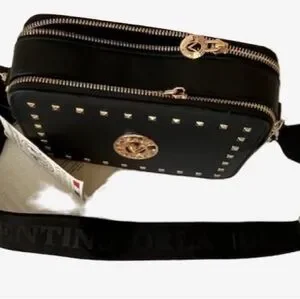 Vegan leather crossbody camera bag by Valentino Orlandi with the "V" logo and studded accents.