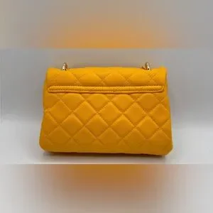Chic yellow quilted design. Pearl-accented chain strap. Stylish and versatile.