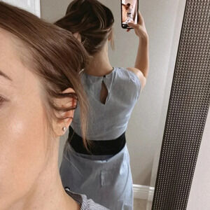 Delicate and feminine striped dress in blue and white stripes with navy detailing.