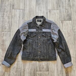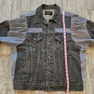 This is the coolest vintage denim jacket you will find! It was customized by hand, the blue and white stripe inserts give it the most amazing puff sleeves.