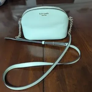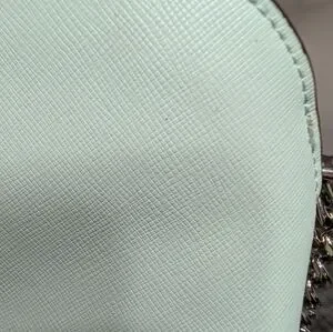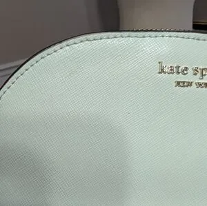 Kate Spade Light Green/Seafoam Cross Body, adjustable strap with chain details. Has a front pocket and inside zipper pocket. Big enough to carry a phone, makeup, small wallet, etc. Small stain on inside and tiny dots on outside that are barely noticable. Honestly looks new!