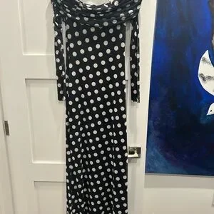 Never worn- tags removed . Figure flattering off the shoulder polka dot maxi dress. Can be worn with boots or belted for a more casual vibe . Great for travel .Purchased new from Anthropologie. 95% polyester, 5% spandex