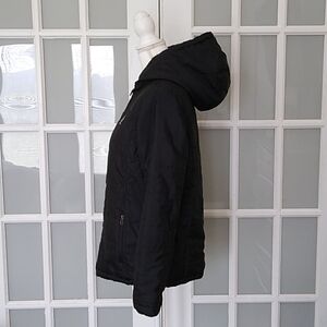 Comfortable hooded reversible puffer style jacket that is perfect for staying warm on outdoor adventures. Has a total of 4 pockets, 2 outside zipper pockets on the hard shell and 2 slip pockets on the faux fur side.