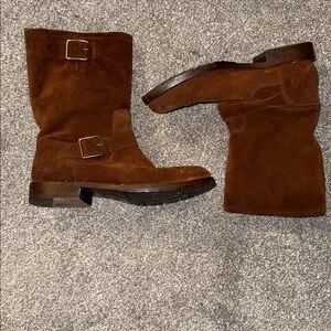 Frye Stylish brown suede boots with buckle details. Perfect for a chic look.