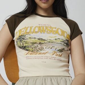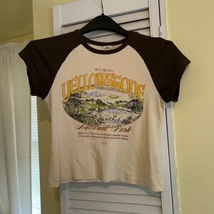 Short sleeve tee with Yellowstone graphic. Brown sleeves and cream body. Casual and stylish.
