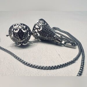 This handmade silver-toned intentional necklace is more than an accessory — it’s a keepsake of what truly matters. Nestled within its exquisitely detailed caged pendant is a compartment that gently unlatches, revealing space for a handwritten scroll.