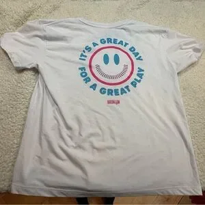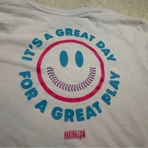 Enjoy a casual day with this stylish white graphic tee featuring playful blue and pink accents. Perfect for a relaxed outing. Pink and Blue SMILEY FACE graphic on chest. Baseballism logo on bottom of graphic on back | Smiley face has baseball stitching for mouth. NEW WITH TAGS.