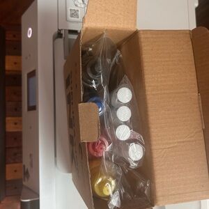 Epson ET-15000 printer in white. Includes a set of sublimation inks: black, cyan, magenta, yellow.