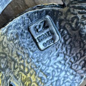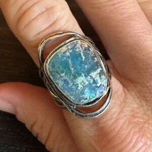 This is a vintage Roman Glass ring with blue iridescent Roman glass bezel set in 925 sterling silver, by PZ or Paz.