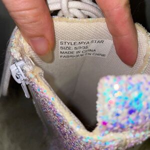Tried on only and have been sitting in a closet on the floor without a box. Lace up with zippers to put on. Being sold as is as shown. Cat friendly home. Thank you for looking.