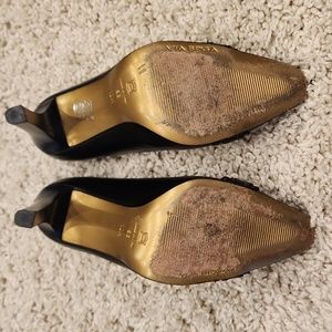 Nice black leather with stitching, buckle toe, classic heels (about 3.5"-4").