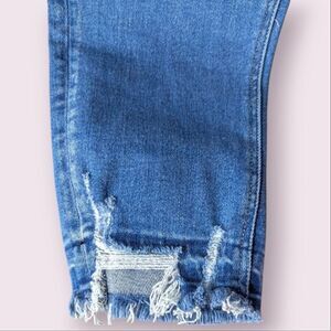 Super stretchy high rise denim jeans have a nice weight and feature a medium rinse, button fly and raw distressed hems to add a little punk. Excellent like new condition.