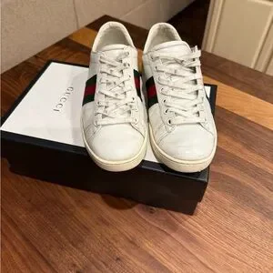 Elegant Gucci sneakers with signature green and red accents. Shown signs of wear in photos. Comes with dust bags & box. These are 35.5, but I am a 6.5/7 & these fit perfect. Comes with new pack of laces.